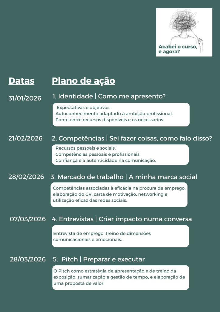 Por isso, criamos este programa “Acabei o curso, e agora?” que, em pequeno grupo, oferece um espaço para pessoas que já terminaram os seus estudos ou estudantes universitários finalistas explorarem quem são e construírem a sua identidade, com o apoio de ferramentas práticas que promovem o autoconhecimento, a autoconfiança, a comunicação e a gestão de expectativas.